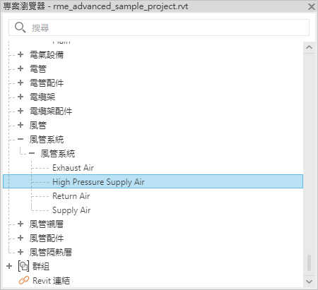 在以下範例中,High Pressure Supply Air 是建立自「進氣」系統類型,並且具有相同的系統分類。