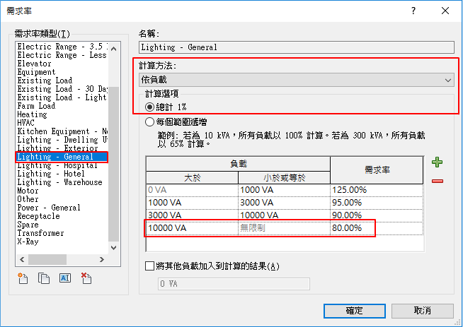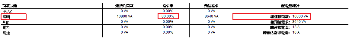 照明需求率已指定為由荷載與總計算來計算,以百分比表示。如果荷載大於 10000VA,則需求率是 80%。
