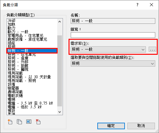照明需求率已指定給對應的照明負載分類類型。