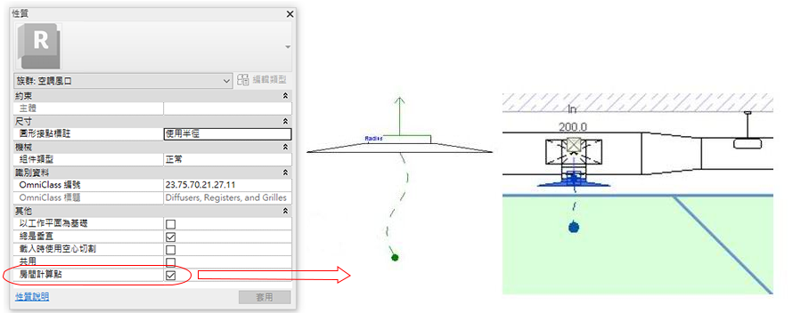 有時候,空調風口的放置方式可能使接點的位置不在空間內。房間計算點是一個用來判斷空調風口位於哪個空間的搜尋點。您可以為空調風口