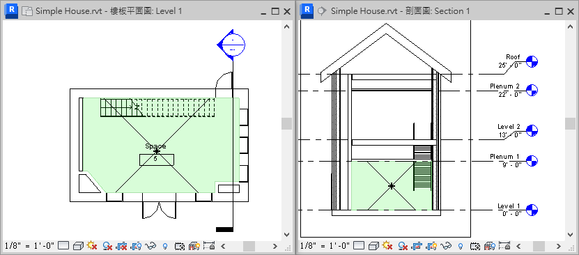 您可以使用現有剖面視圖,但請確定剖面線與您要在其中放置空間的區域相交。在以下範例中,僅需要一個剖面視圖,因為每個樓層係由單一空間組成。您可能需要其他剖面視圖,取決於設計的複雜度。