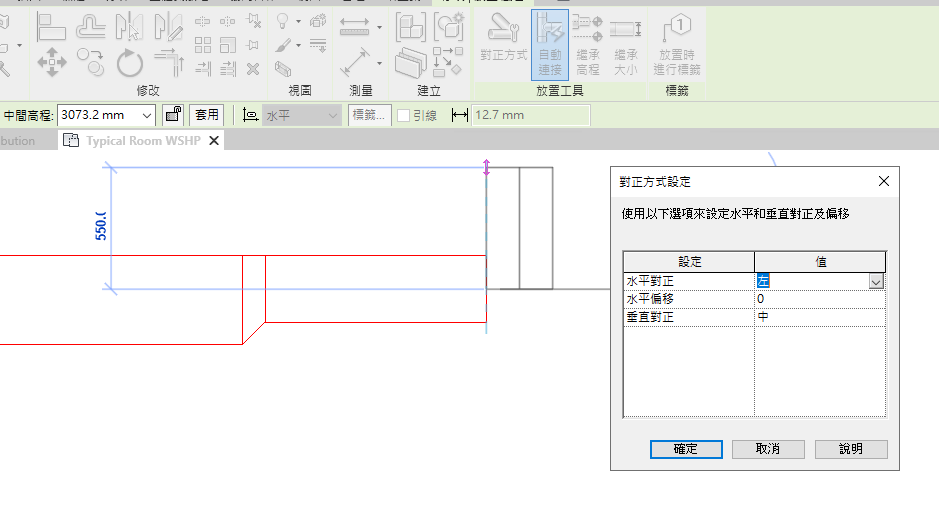 水平對齊風管剖面的邊緣,並使用風管的「中心」、「左」或「右」作為參考。