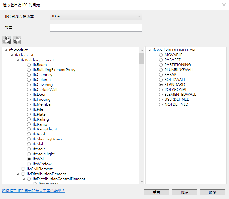 對話方塊可協助您將 IFC 圖元和預先定義的類型對映至族群實體和類型。此對話方塊可讓您選取 IFC 資料架構,然後搜尋特定 IFC 圖元。在對話方塊中選取圖元和類型,這些圖元和類型會套用至模型中元素上的參數。同樣對話方塊可用來控制 IFC 匯出中包括的圖元。 請參閱指定族群的 IFC 圖元。