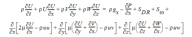 where U is the mean velocity and u' is the fluctuation about that mean. This representation is substituted into the governing equations and the equations themselves are averaged over time. Using the notation that capital letters represent the mean values and lower case letters represent fluctuating values except for temperature, the averaged governing equations can be written as: