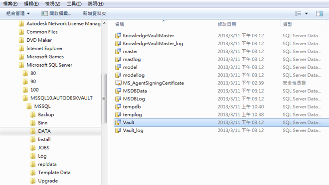 安裝 Autodesk Vault Server 時,會建立名為 Vault 的單一 Vault。此 Vault 的資料庫檔案建立於 Microsoft SQL Server 安裝資料夾下的 MSSQL$AUTODESKVAULT\Data 資料夾中。