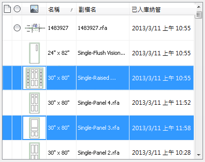 網格顯示符合目前搜尋參數的 Revit 族群類型。選取一個 Revit 族群類型,以載入該族群類型。