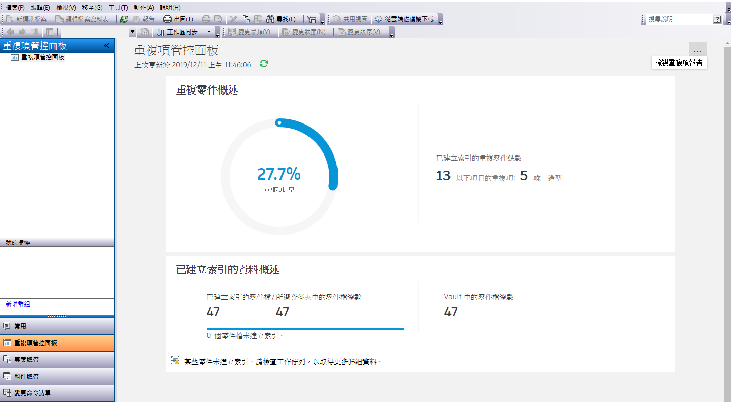 使用該管控面板可檢視重複零件和已建立索引之零件的狀態。