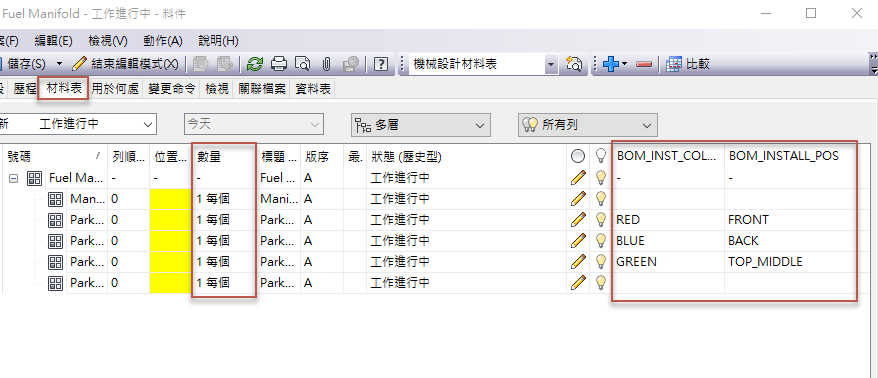 若要顯示例證性質,您需要自訂 Vault 中的材料表列性質,並建立新材料表列性質,以對映至具有例證性質值的檔案性質。