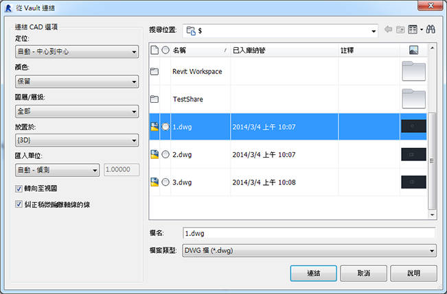 將 Vault 中儲存的 DWG 插入到目前的 Revit 專案。