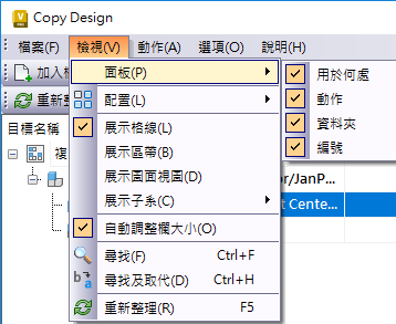 浮動面板、變更停靠位置,或關閉面板以使其不顯示,來簡化 Copy Design 介面。