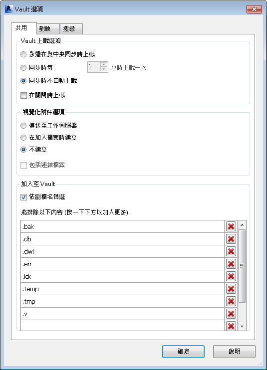 在「加入至 Vault」區段中,規劃哪些類型的檔案無法加入至 Vault。