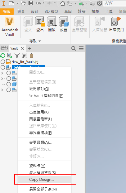 - 在 Inventor 中,於 Vault 瀏覽器中的檔案上按一下右鍵,然後按一下「Copy Design」。