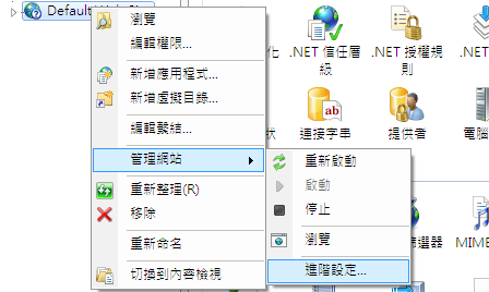 - 在「Internet Information Services」對話方塊中,展開本機電腦 ►「網站」,在「預設網站」上按一下右鍵,然後選取「編輯繫結」>「管理網站」>「進階設定」。