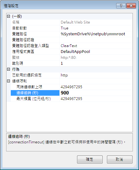 - 展開「連線限制」,將「逾時」的值變更為 900,然後按一下「確定」。