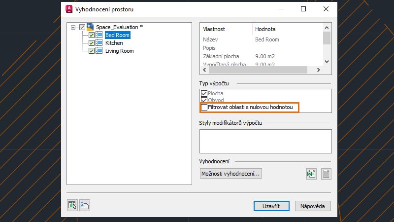 Dokumentace vyhodnocení prostoru vypočítá a vyhodnotí informace o prostoru vašeho dokončeného půdorysu podlaží. Při ručním definování prostorů však mohou vzniknout nepřesnosti u velmi malých prostorů. Tyto nepřesnosti mohou vést k dílčím plochám s hodnotami plochy blízkými nule. Takové malé hodnoty ploch se někdy do výkazu vyhodnocení prostoru nemusí vůbec uvádět.