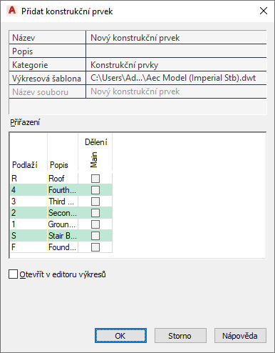 | přiřadit konstrukční prvek k hladině a dělení | v tabulce přiřazení vyberte správnou hladinu a dělení. Vyberte požadovaný řádek hladiny a sloupec dělení a zaškrtněte příslušné políčko. Poznámka: Měli byste zaškrtnout pouze jednu hladinu a dělení. Více hladin a dělení vytváří rozsahové konstrukční prvky.