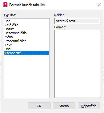 V závislosti na zvoleném typu dat zobrazí seznam relevantních typů formátu. Jestliže jste například zvolili jako typ dat Úhel, bude Formát obsahovat určité možnosti, například Stupně desítkově, Grady, Radiány atd.