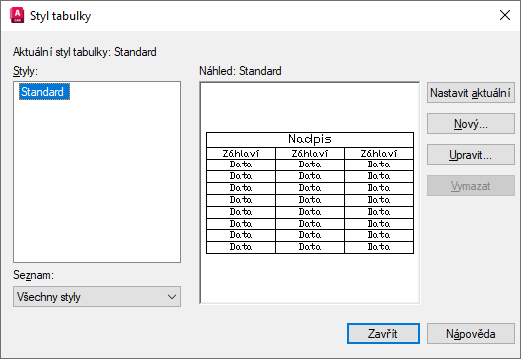 Vymaže styl tabulky vybraný v seznamu Styly. Styl použitý ve výkresu nelze vymazat.