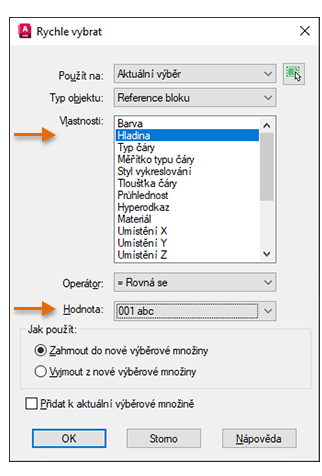 Aktuálně jsou vybrány všechny bloky na hladině 001 abc. Všimněte si, že se možnost Použít na automaticky přepnula na hodnotu Aktuální výběr, jak je znázorněno níže.