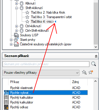 V podokně Seznam příkazů přetáhněte příkaz, který chcete přiřadit tlačítku myši, v podokně Uživatelské úpravy v