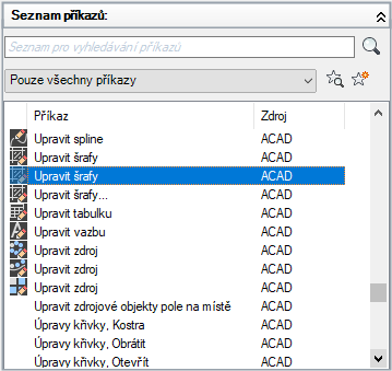 Podokno Seznam příkazů obsahuje všechny příkazy, které jsou k dispozici v aktuálně načtených souborech CUIx. V seznamu můžete vybrat existující příkaz a upravit jeho vlastnosti nebo vytvořit nový příkaz. Jestliže vytvoříte nový příkaz, bude přidán do souboru CUIx, který je zobrazen v rozevíracím seznamu v horní části podokna Uživatelské úpravy: <název souboru>.