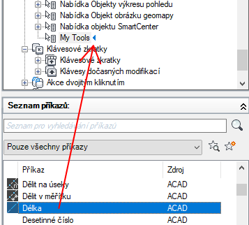 - V podokně Seznam příkazů přetáhněte příkaz, který chcete přidat do místní nabídky, do podokna Uživatelské úpravy: <název souboru>.