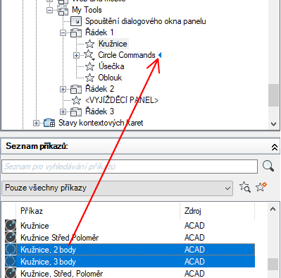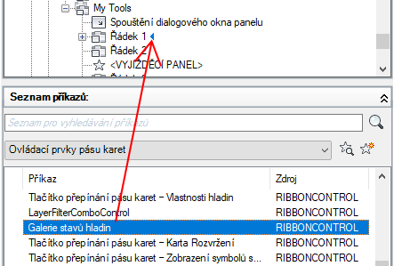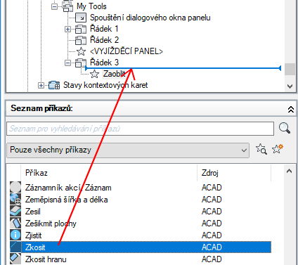 - Přetáhněte ovládací prvek z podokna Seznam příkazů na řádek na panelu pásu karet.
