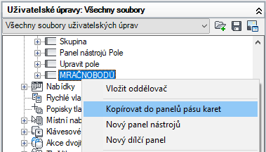 - Pravým tlačítkem klikněte na panel nástrojů, který chcete zkopírovat a převést na panel pásu karet. Vyberte položku Kopírovat do panelů pásu karet.