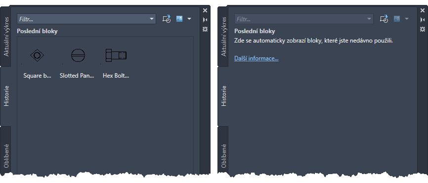 Na kartě Poslední na paletě Bloky se zobrazují snímky naposledy vložených nebo vytvořených bloků v aktuálním výkresu. Poslední bloky výkresu můžete synchronizovat do cloudového úložiště a získat k nim přístup z libovolného zařízení pomocí aplikace AutoCAD pro stolní počítače nebo