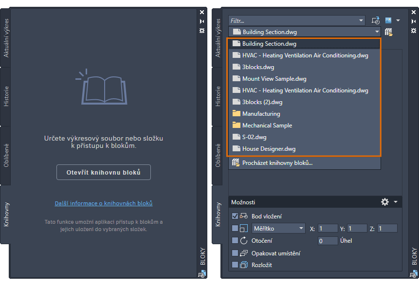 Karta Ostatní výkresy na paletě Bloky byla přejmenována na kartu Knihovny. Nyní můžete zadat složku, soubor výkresu nebo libovolnou definici bloku uloženou ve výkresu, která bude vložena jako blok do aktuálního výkresu. Karta Knihovny obsahuje rozevírací seznam, který zobrazuje pět naposledy použitých knihoven bloků (složka nebo soubor výkresu), které slouží k urychlení přístupu. Pokud vyberete knihovnu bloků v umístění cloudového úložiště, můžete použít stejné bloky i ve webové aplikaci AutoCAD.