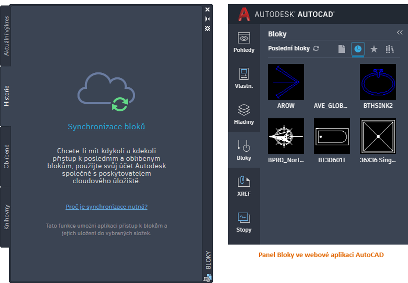 webové aplikace AutoCAD. Klikněte na možnost Synchronizovat bloky, přihlaste se do svého účtu na portálu Autodesk Account a poté určete umístění úložiště v cloudu, kde chcete začít synchronizovat bloky.