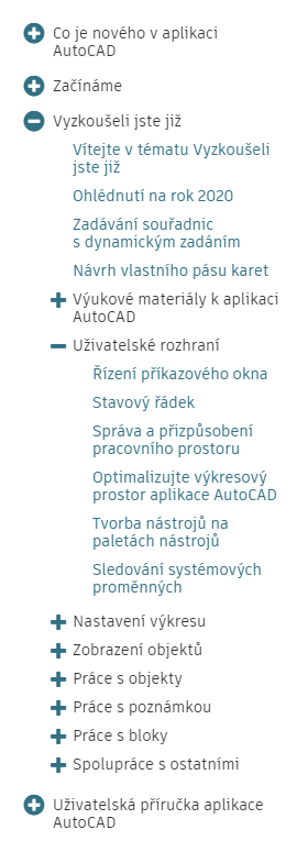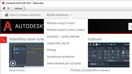 Do nápovědy k aplikaci AutoCAD byla přidána nabídka Rychlé reference. Nabídka je vždy dostupná, ať už se nacházíte na domovské stránce nápovědy nebo si prohlížíte téma uvnitř nápovědy. Možnosti nabídky představují snadný způsob zobrazení seznamu příkazů nebo systémových proměnných a dalších běžně zobrazovaných témat nápovědy.