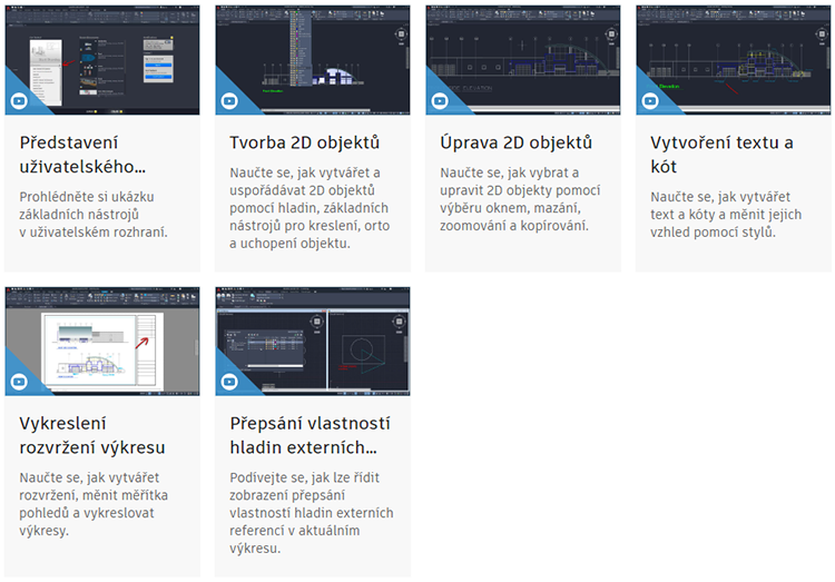 Nápověda k aplikaci AutoCAD obsahuje novou nabídku Rychlé reference, články Vyzkoušeli jste již jsou uspořádány v obsahu a nový formát karet usnadňuje přístup k výukovým videofilmům.