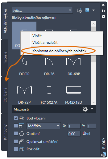 Paleta Bloky nyní umožňuje zkopírovat často používané bloky do nové karty Oblíbené. Na kartu Oblíbené můžete zkopírovat blok z libovolné karty na paletě Bloky.