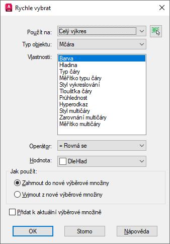 Pokud je vybrána volba Přidat k aktuální výběrové množině,jsou kritéria filtrování použita na celý výkres.