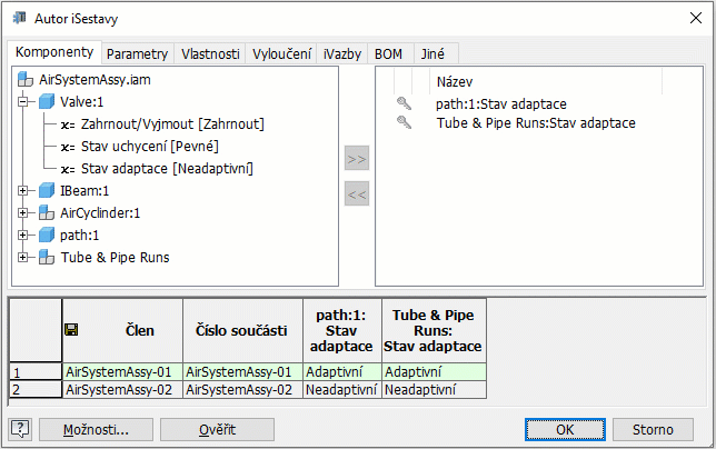 - Po vyplnění všech dalších vlastností iSestavy aplikace Inventor klikněte na tlačítko Ověřit k potvrzení konfigurace této sestavy. Člen sestavy primárních vedení může být například v rodině iSestav adaptivní pouze jednou a sloupec KS rozpisky může obsahovat pouze číslo nebo řetězec Výchozí.