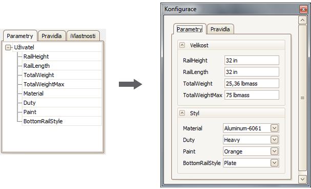Můžete vytvořit vlastní uživatelské rozhraní a připojit ho k parametrům, vlastnostem a pravidlům součásti, sestavy nebo výkresového dokumentu aplikace Inventor.