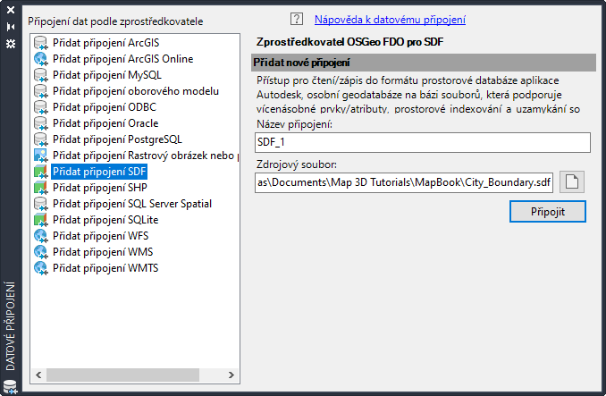 - Pod položkou Zdrojový soubor (vpravo) klikněte na tlačítko procházení a přejděte ke vzorovému souboru City_Boundary.sdf. Klikněte na tlačítko Připojit.