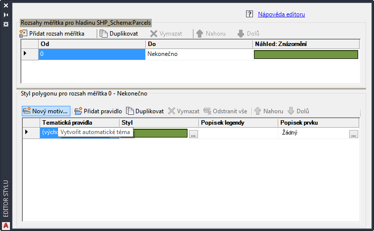 Kliknutím na Nové téma definujte téma pro hladinu Parcely.