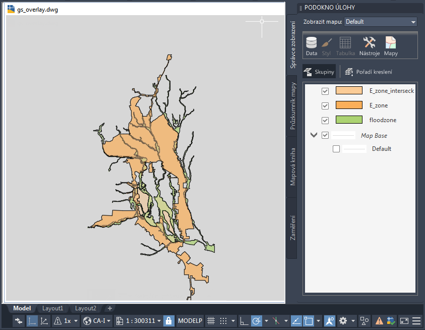 Tato mapa překrývá dvě hladiny (záplavovou zónu a obchodní zónu). Pomocí překrytí zobrazíte, kde se protínají. Tato plocha se stane novou hladinou, kterou je možné stylizovat, uložit do souboru a použít jako samostatné úložiště dat.