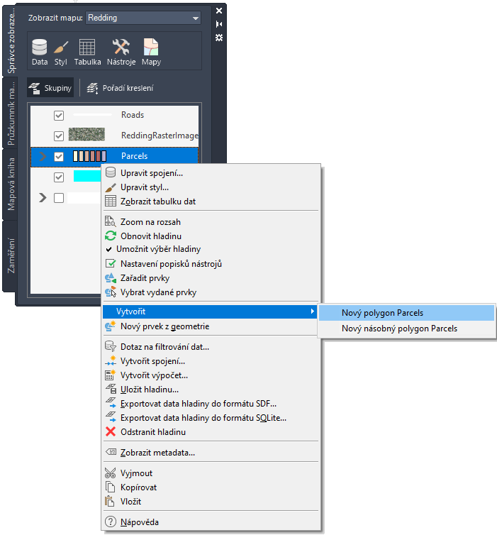 Každá položka v AutoCAD Map 3D toolset má uživatelskou nabídku, která obsahuje příkazy, které jsou pro ni v daném okamžiku dostupné.