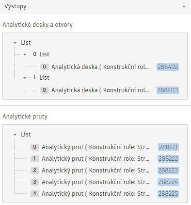 Po vytvoření nebo aktualizaci jsou všechny analytické pruty seskupeny do dvou seznamů: jeden pro pruty a druhý pro desky a otvory.