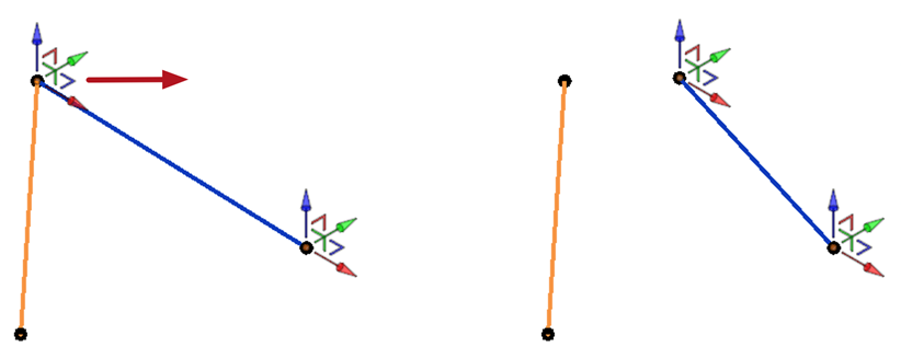 - Polohu analytického prutu můžete řídit úpravou ovládacích prvků prutu. Tyto ovládací prvky se zobrazí, když je vybrán analytický prut. Přetažením ovládacího prvku můžete přesunout konec a stisknutím mezerníku přepnout souřadnicový systém ovládacího prvku: