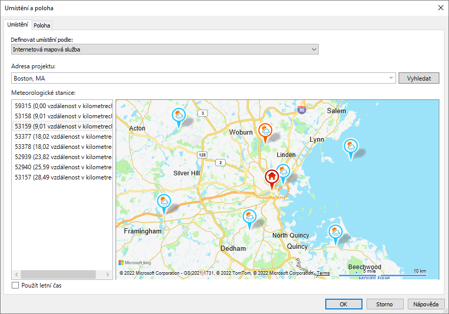Před provedením energetické optimalizace modelu budovy určete její geografické umístění a vyberte nejbližší meteorologickou stanici.