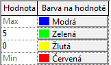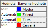 Ve výchozím nastavení jsou dvojice Max (maximální) a Min (minimální) hodnota-barva. Tyto hodnoty jsou relativní vzhledem k zobrazeným datům. Nastavit lze pouze barvy pro hodnoty Min a Max. Tyto dvojice hodnota-barva nelze vymazat.