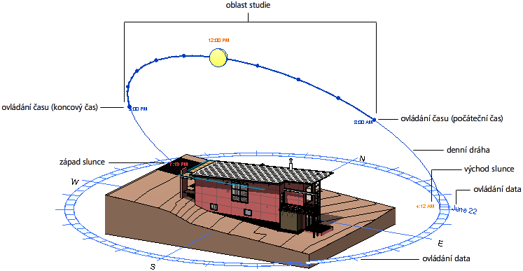 | Denní dráha | Zakřivená dráha, po níž se určený den na obloze pohybuje slunce. Viditelná v režimech Stálé, Jednotlivý den a Ve více dnech. | Stálé a Jednotlivý den: Přetažením slunce po denní dráze lze změnit čas, přetažením samotné denní dráhy lze změnit datum. Ve více dnech: Přetažením denní dráhy lze změnit počáteční nebo koncové datum studie. |