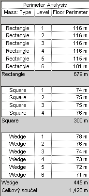 Ve výkazu jsou uvedeny celkové lineární rozměry na základě sloučených obvodů podlaží objemu. Pomocí těchto údajů lze odhadnout stavební náklady pro daný návrh.