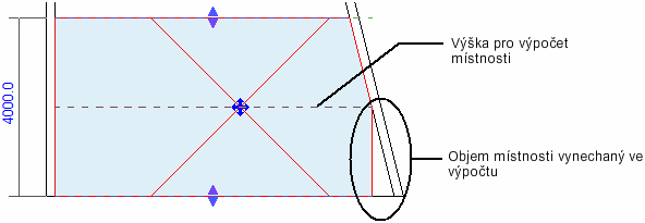 Pohled řezu místnosti při zapnutém výpočtu objemu