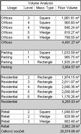 Výkaz znázorňuje objem jednotlivých podlaží objemu, mezisoučty objemu podle využití a celkový součet sloučených podlaží objemu. Pomocí těchto údajů můžete odhadnout zatížení z hlediska vytápění, větrání a klimatizace na základě plánovaného využití jednotlivých objemových podlaží.
