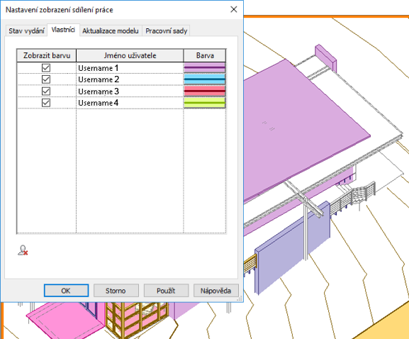 Poznámka: Barvy přiřazené vlastníkům přetrvávají, dokud není uživatel odstraněn. Ve výchozím nastavení jsou v seznamu uvedeni všichni vlastníci, kteří upravovali centrální model.
